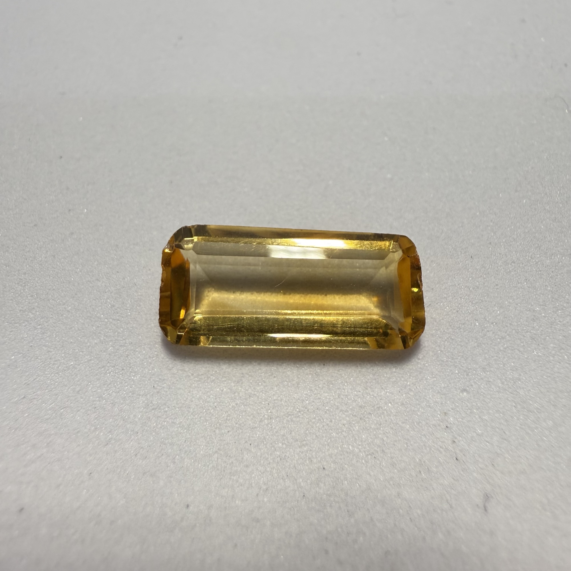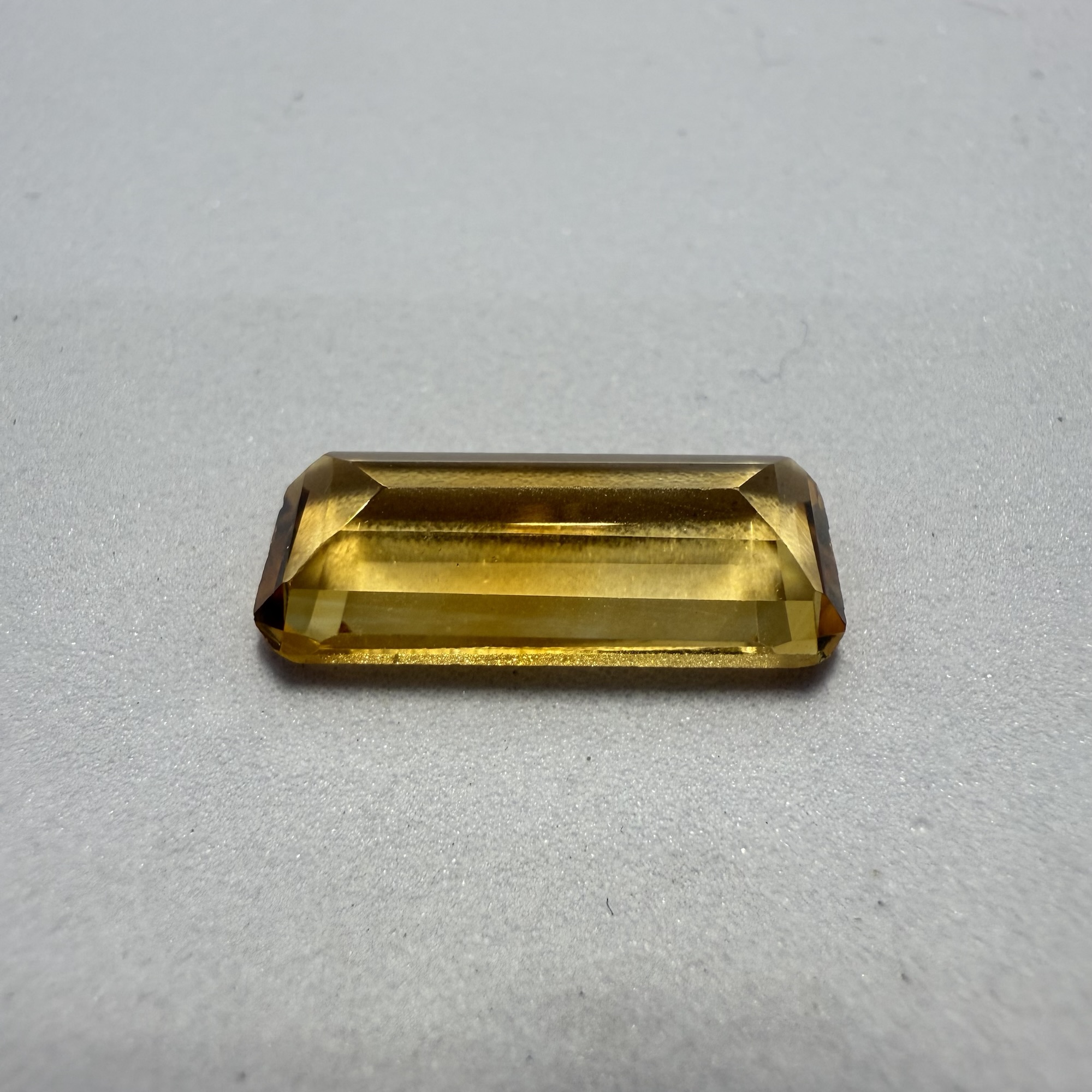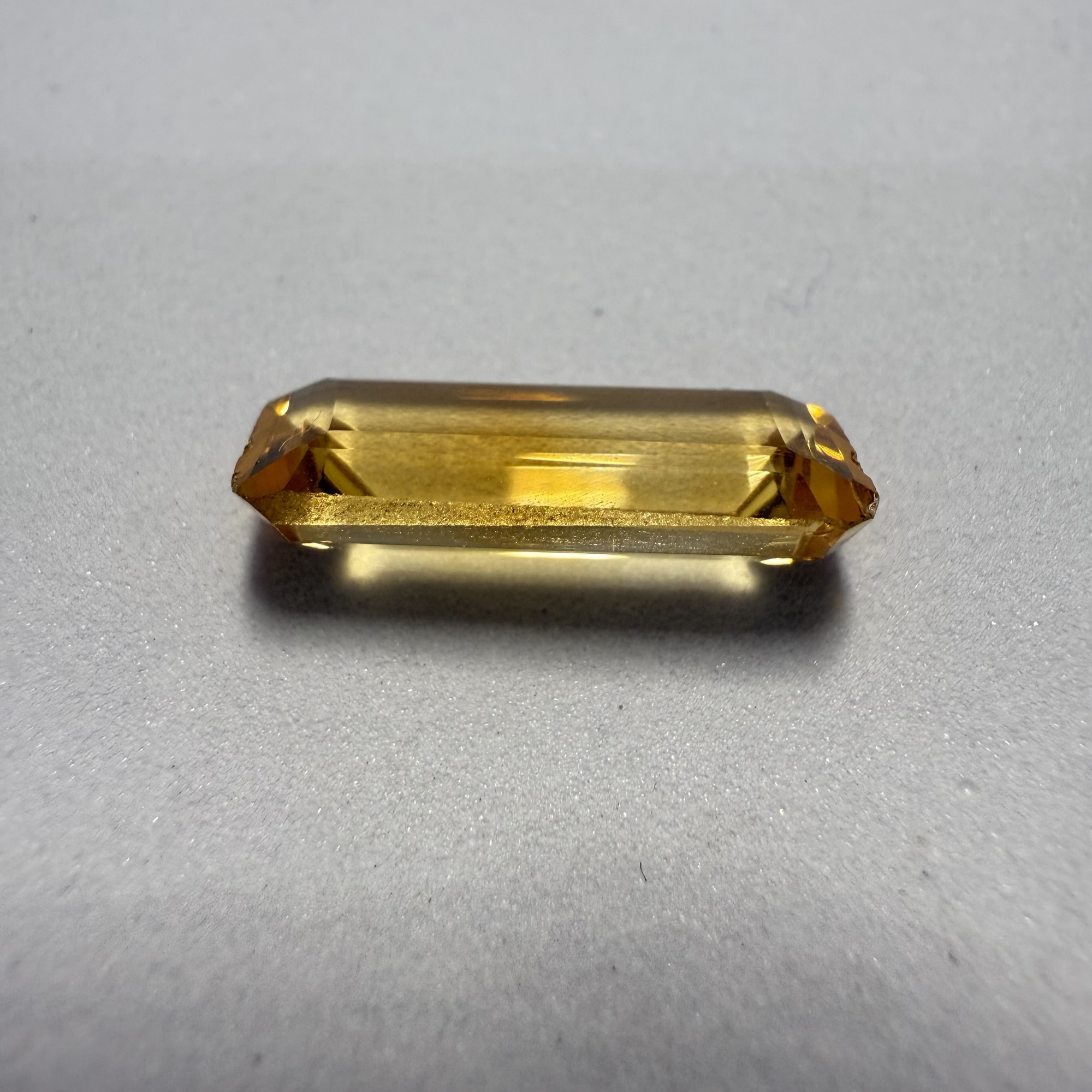 This remarkable 5.60 carat natural citrine, featuring a sleek rectangular emerald cut, showcases a luminous honey-amber tone—the perfect embodiment of autumnal warmth and high-end elegance. Its elongated step-cut facets highlight exceptional clarity, producing a sophisticated architectural glow that catches the light from every angle. This substantial, resilient gemstone is a premier selection for a contemporary cocktail ring or a striking pendant, offering a bold aesthetic and a distinctively refined character.