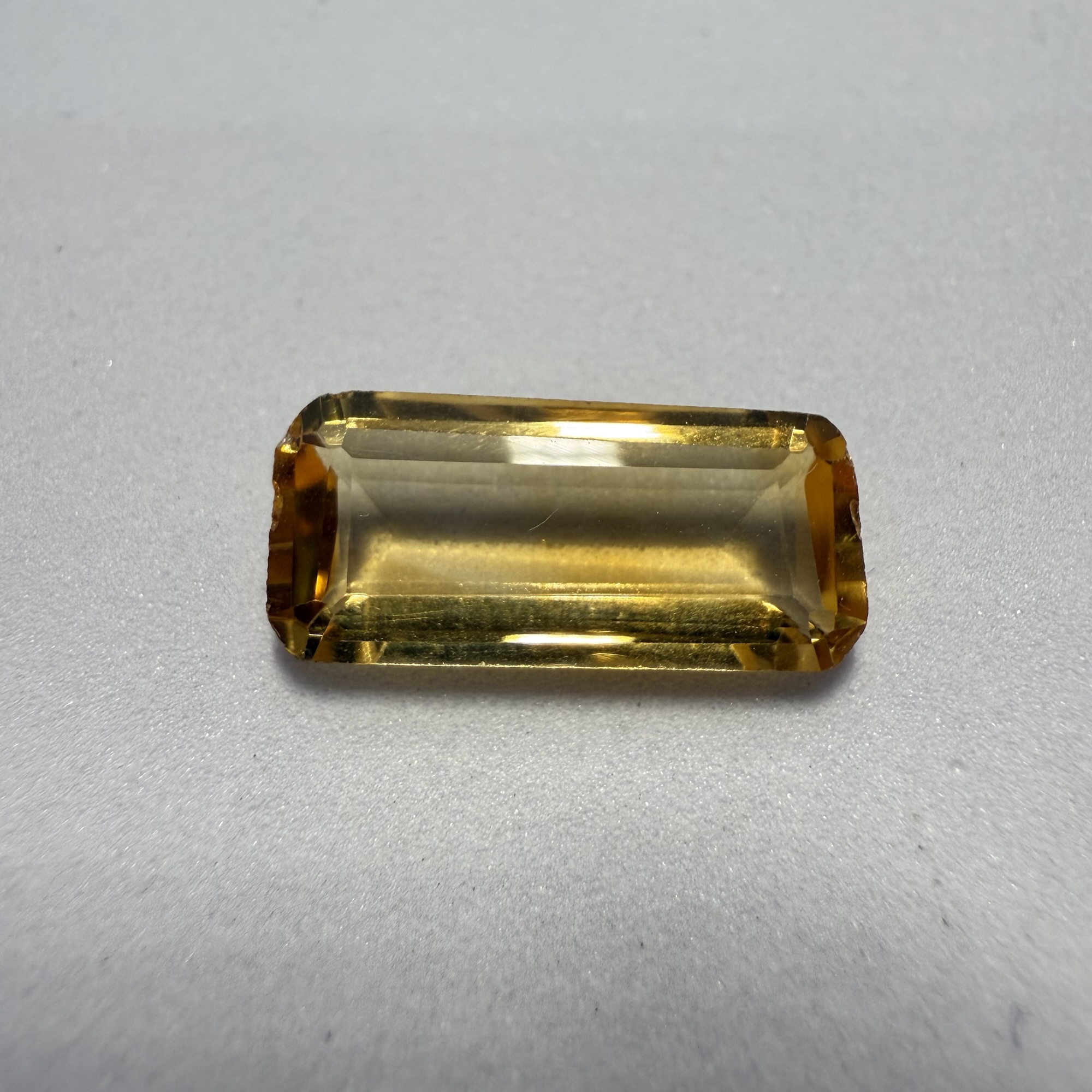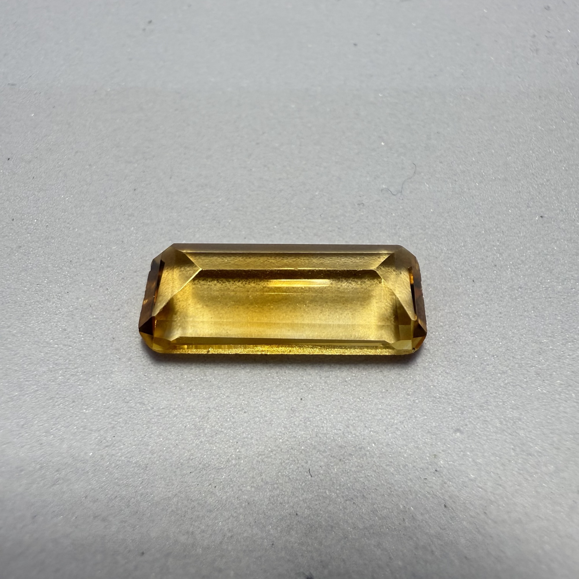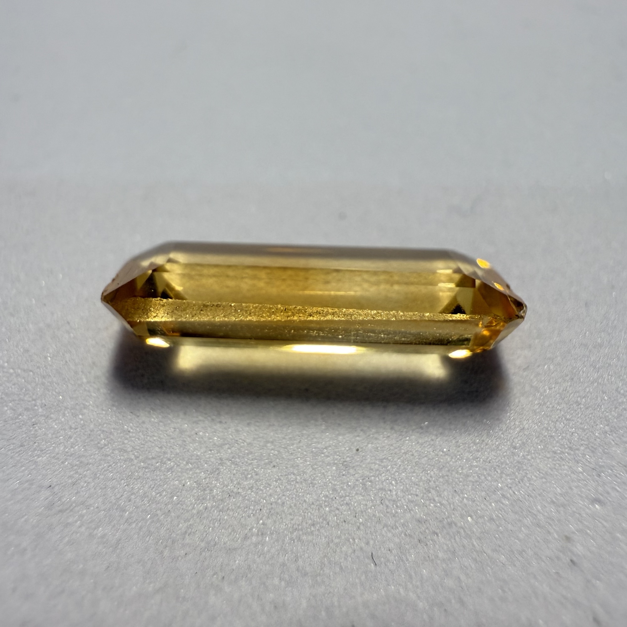 This remarkable 5.60 carat natural citrine, featuring a sleek rectangular emerald cut, showcases a luminous honey-amber tone—the perfect embodiment of autumnal warmth and high-end elegance. Its elongated step-cut facets highlight exceptional clarity, producing a sophisticated architectural glow that catches the light from every angle. This substantial, resilient gemstone is a premier selection for a contemporary cocktail ring or a striking pendant, offering a bold aesthetic and a distinctively refined character.